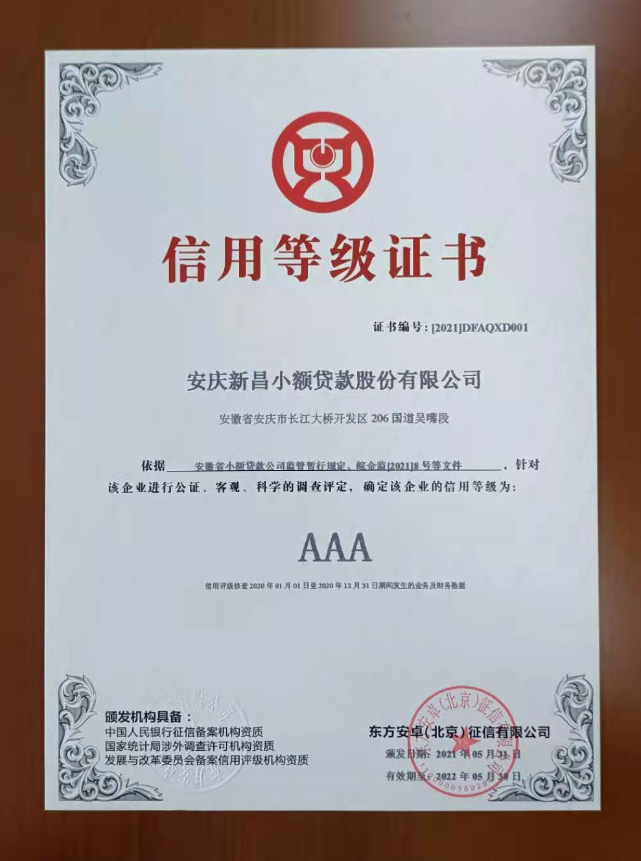 2021年7月1日,安徽省地方金融監(jiān)督管理局正式公布了評(píng)級(jí)結(jié)果,安慶新昌小額貸款股份有限公司監(jiān)管等級(jí)為AAA,成為安慶市2020年度唯一一家被評(píng)為AAA等級(jí)的小額貸款公司!